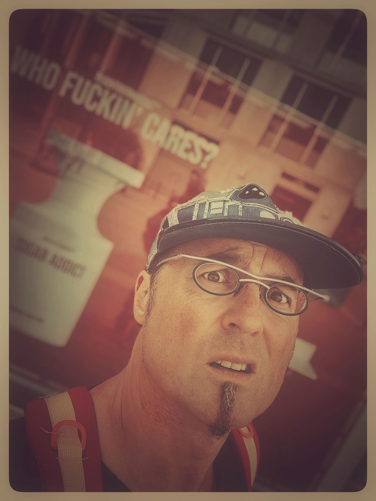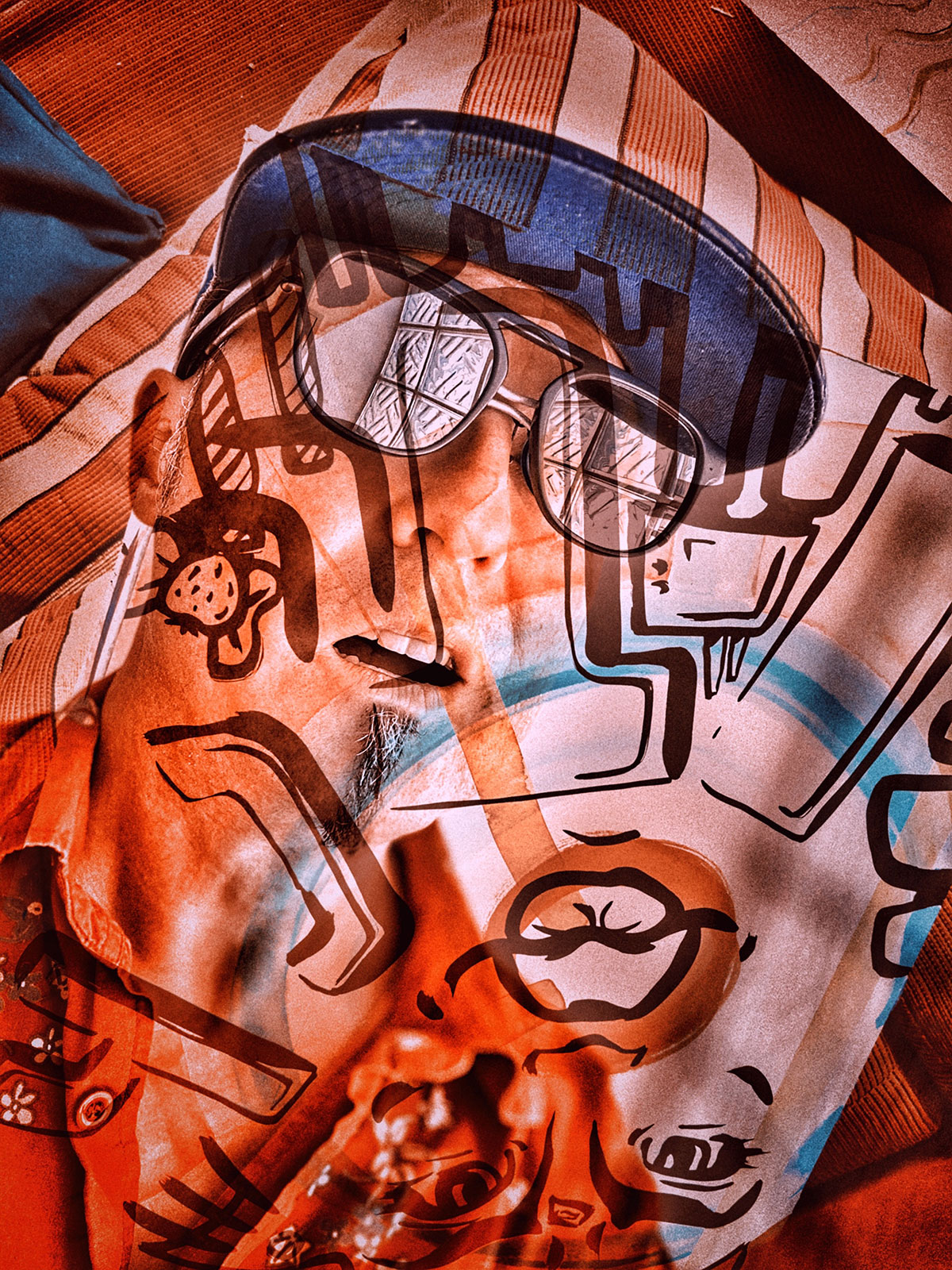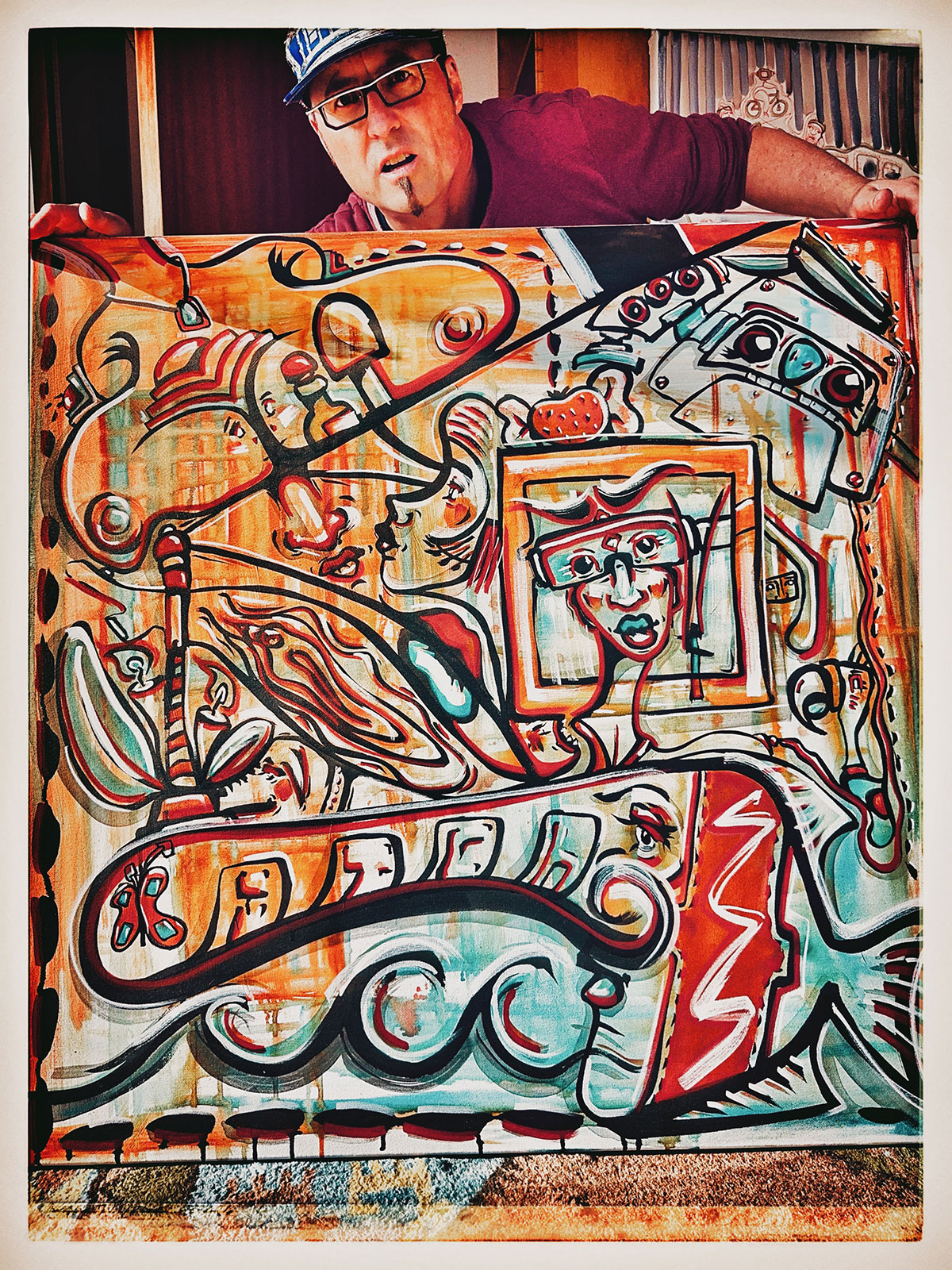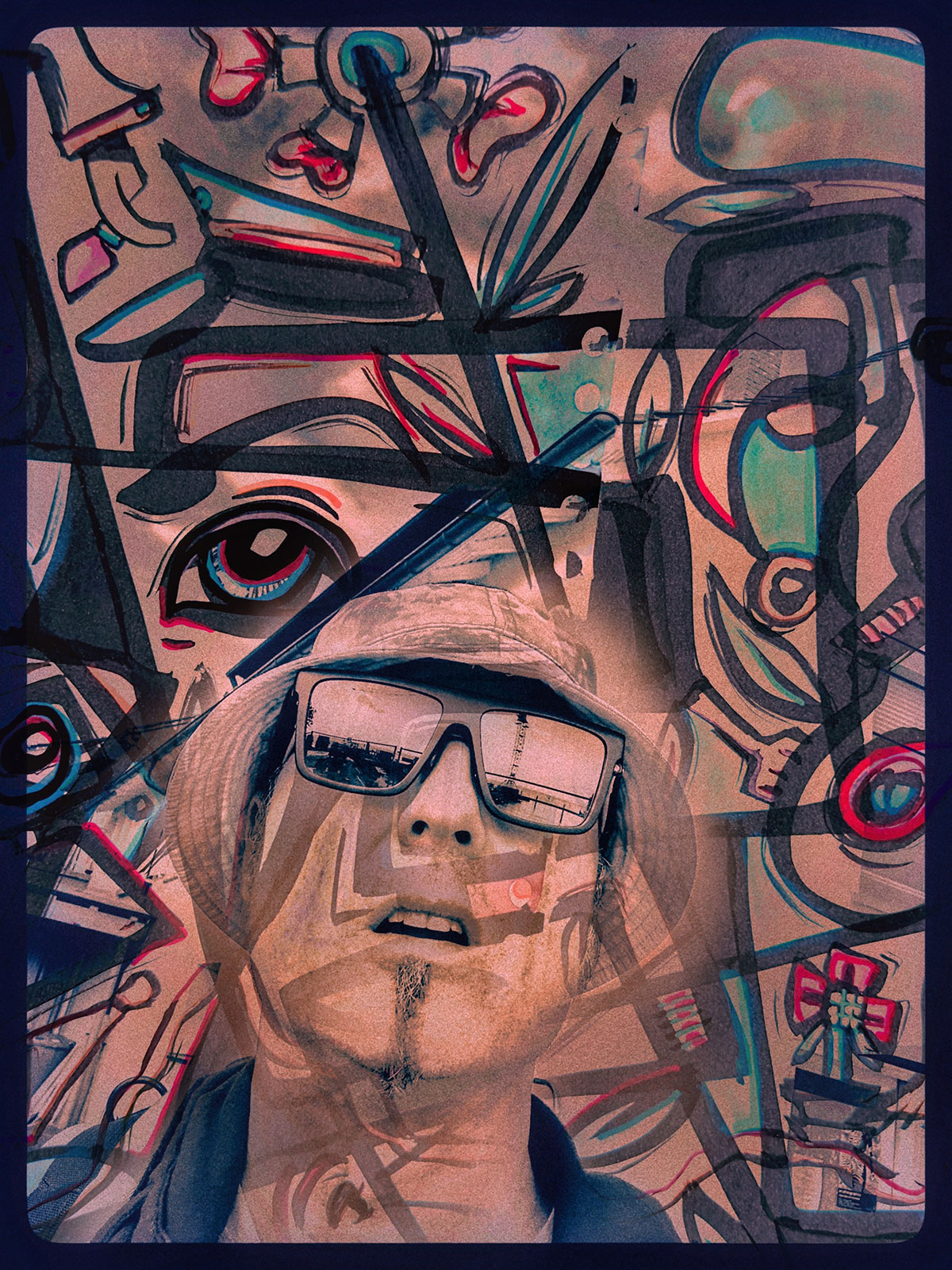 Meine Art zu malen beinhaltet ganz grundlegend eine Art visuelle Sprache mit einem begrenzten Repertoire an Vokabeln. Das sind stets wiederkehrende Symbole, die jeweils Bedeutungscontainer sind und auf der Bildfläche Beziehungen eingehen zueinander. Je nach Nähe und farblich ähnlicher Ausgestaltung entstehen Übereinstimmungen oder Widersprüche. Im Kern gibt es vier Elemente, die auf keinem vollständigen Gemälde von mir fehlen: Der Langnasendoktorfisch, die Erdbeere mit Schleifen, das Wort „ITCH“ und die Zahl 44. Jeder dieser Teile kommt mit einem gewissen Spektrum an Deutungsmöglichkeiten daher wie eben jedes Wort in einer Sprache auch. Diese vier Elemente müssen als Aufgabenstellung an mich selbst auf wirklich jedem vollständigen Gemälde vertreten sein. Sie haben alle eine besondere Geschichte mit starker Verbindung zu meinem Leben. Bei Interesse erzähle ich diese Geschichten. Aber es gibt noch eine ganze Menge mehr Symbole, die wie Wörter einer Sprache immer wieder auftauchen und mit sich eben auch ein gewisses Deutungsspektrum mitbringen. Gesichter spielen eine wichtige Rolle in den Gemälden. Wie diese auftauchen dürfen und an welche Regeln sie sich dabei halten müssen, ist zum Teil in meinem Kopf recht straff vorgegeben. Die Gesichtsausdrücke und Sichtachsen gestalten wesentlich die Atmosphäre und Stoßrichtung des Bildes.