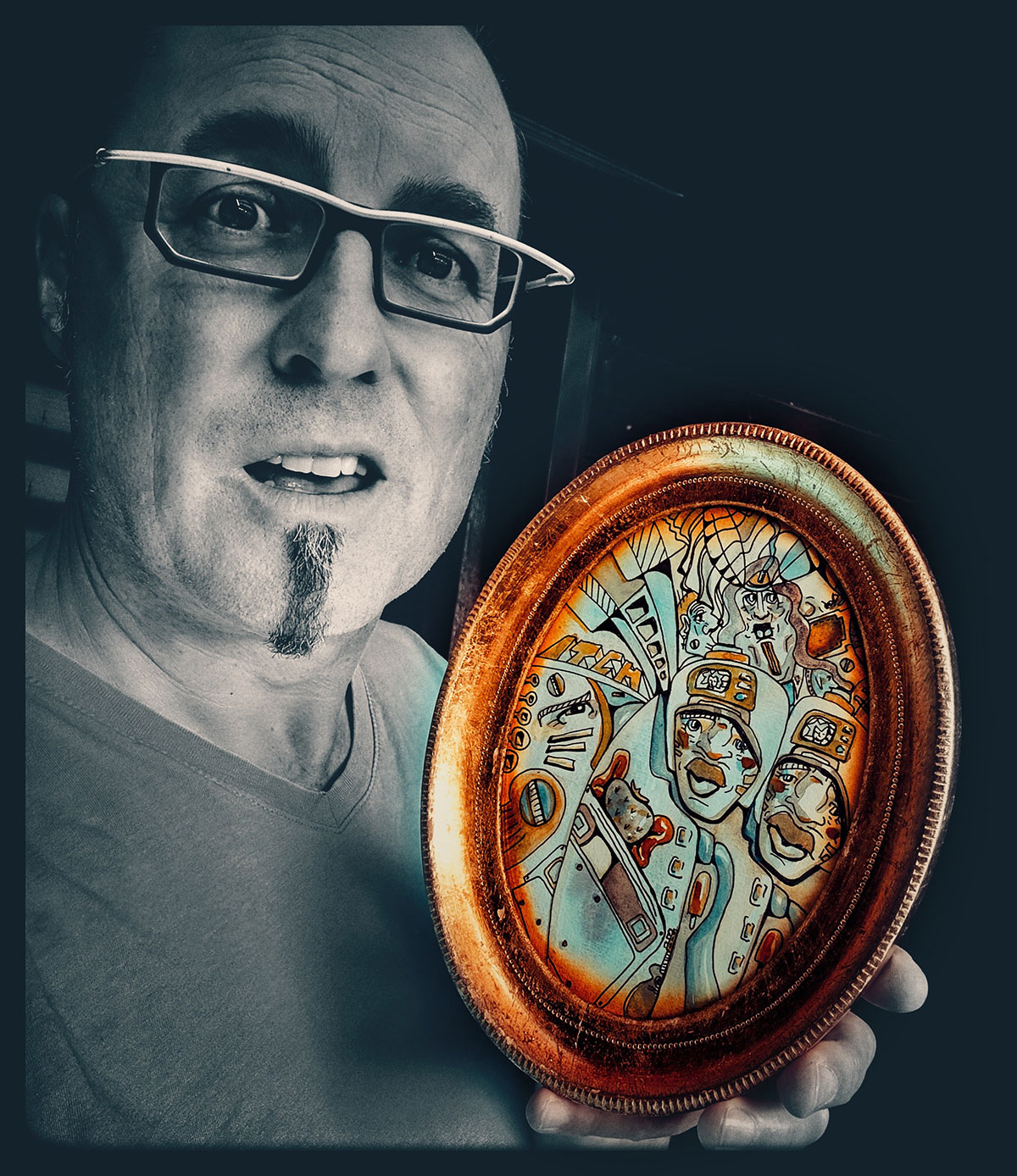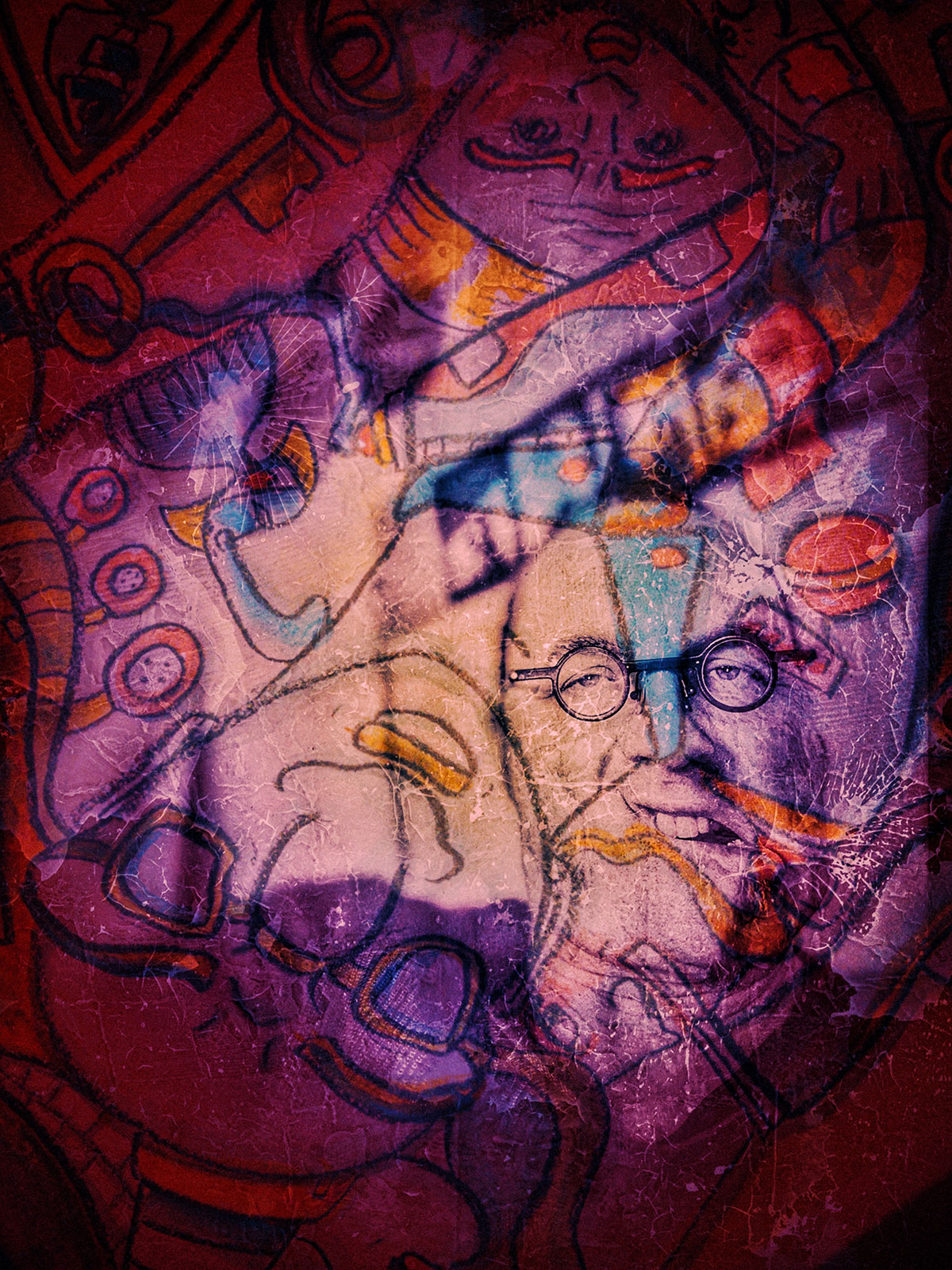 Man kann beim oberflächlichen Betrachten meiner Bilder schwer den immensen Energieaufwand ermessen, der die Komposition der Bildelemente zueinander möglich macht. Wo welches Element in Bezug auf welche anderen welche Rolle einnimmt, ist ein komplexer Prozess, der in Echtzeit richtig kräftezehrende emotionale und intuitiv-assoziative Arbeit ist. Da wird richtig Energie verbrannt, der Puls geht hoch, ich durchlebe Geburtsprozesse und Auseinandersetzungen mit physisch messbaren Symptomen. Ein Beobachter sieht mich vielleicht im Dialog mit mir selbst und unsichtbaren Protagonisten und Antagonisten. Oder er sieht mich da nur sitzen und kriegt von alledem nichts mit, während meine Hände Dinge entstehen lassen. Meine fertigen Zeichnungen stellen immer auch Psychogramme von zwischenmenschlichen Verflechtungen dar. Das könnten auch systematische Skizzen eines Familientherapeuten nach einer kontroversen Sitzung sein. Lange Zeit gab es Überlegungen, ob nicht das Medium Film ein Weg für mich wäre. Schon als Kind filmte ich auf Super8. Später hat mich immer auch das Filmen auf VHS und S-VHS fasziniert. In der Schule hatte ich eine Theatergruppe gegründet, Hörspiele und Drehbücher geschrieben und mit Freunden Sketche und Musikvideos produziert. Später kam ich in die zweite Runde beim Bewerbungsverfahren der Filmakademie BW. Aber ich wurde dann doch nicht genommen und musste mir eingestehen, dass echte, reine Filmmenschen anders ticken als ich. Ich mag das Medium. Aber mein eigentliches ist in erster Linie das zweidimensionale Bild, eine einzelne Momentaufnahme, in die sich der Betrachter vertiefen kann, ohne ein vorgegebenes Zeitelement. Und weil sich meine Symbole und Figuren mit all ihren Anziehungen und Abstoßungen so dynamisch anordnen, ist besonders dieser eine Moment, wo jemand auftaucht und ein Bild davon festhält, bemerkenswert. Manche der so Festgehaltenen schaffen es noch, eine gewisse Pose einzunehmen oder ihre Mimik hinzudeichseln. Aber im Großen und Ganzen wurden alle in ihrer prächtigen und auch abstoßenden Bandbreite erwischt und aufgedeckt. Man kann meine Gemälde auch als Polizeifotografie im Sinne eines Beweismittels sehen, wo Täter in Flagranti erwischt wurden. Wer forensisch hinschaut, kommt den wahren Schuldigen auf die Schliche und durchschaut die falschen Opfer.