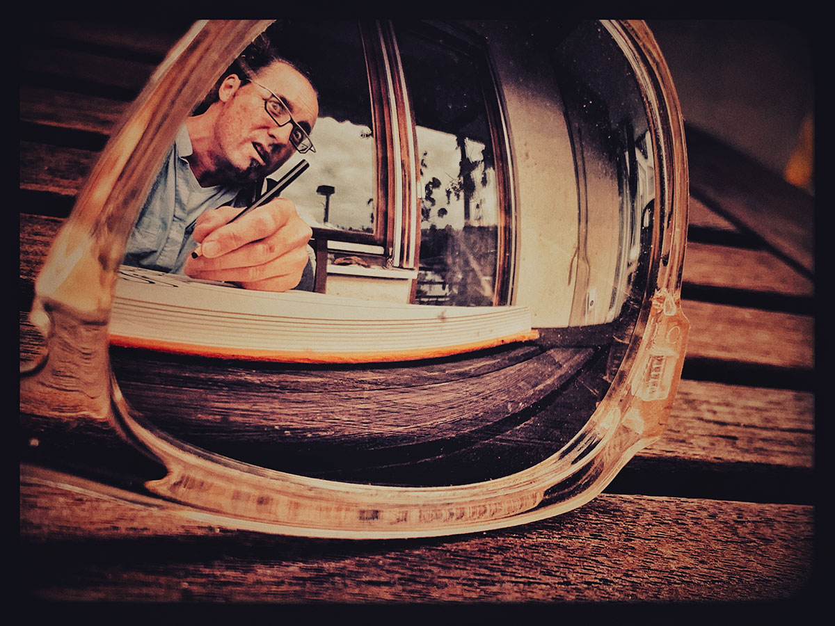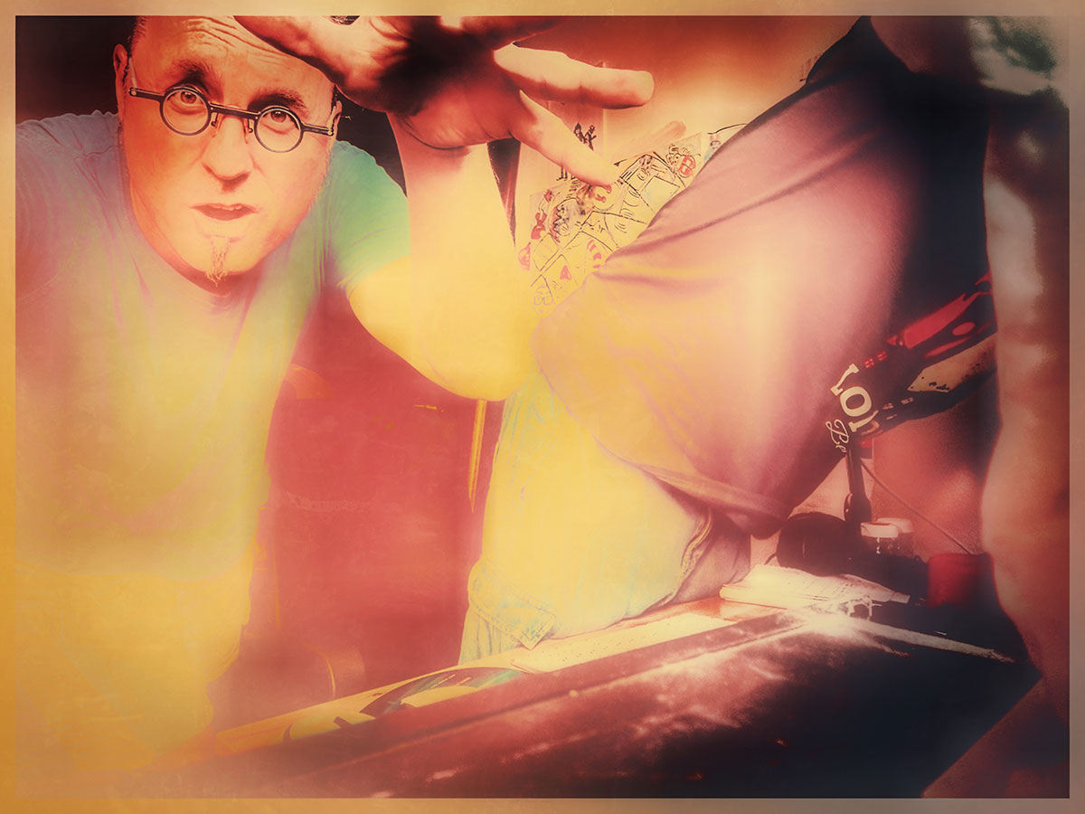 Noch kann ich nicht rein vom Verkauf meiner Bilder meine Familie ernähren. Wie bei den meisten Künstlern bleibt es erst mal eine Mischkalkulation. Eine bescheidene Lebensführung, wo viel selbst gemacht und repariert wird in Kombination mit kleineren Zusatzeinnahmequellen wie Gitarrenstunden, Workshops und der gelegentliche Fotojob sorgen dafür, dass dieses Leben möglich ist und dabei das Vatersein und das Leben als Künstler gleichermaßen mit vollem Herzen ausgefüllt wird. Damit meine Kinder nicht finanziell unter meinem kargen Künstlerleben leiden mussten, begleitete ich als letzten kommerziellen Art Director Job einen hochwertigen Fliesenleger viele Jahre bei seiner visuellen Außenpräsentation, gestaltete ihm Kunstplakate, Textilien und skurril gebastelte Einladungskarten und bedruckte seine gesamte Fahrzeugflotte mit einem Holzschnitt von mir. Das machte Spaß, brachte etwas finanzielle Sicherheit und ließ mich was mein grafisches Handwerk angeht in Übung bleiben.